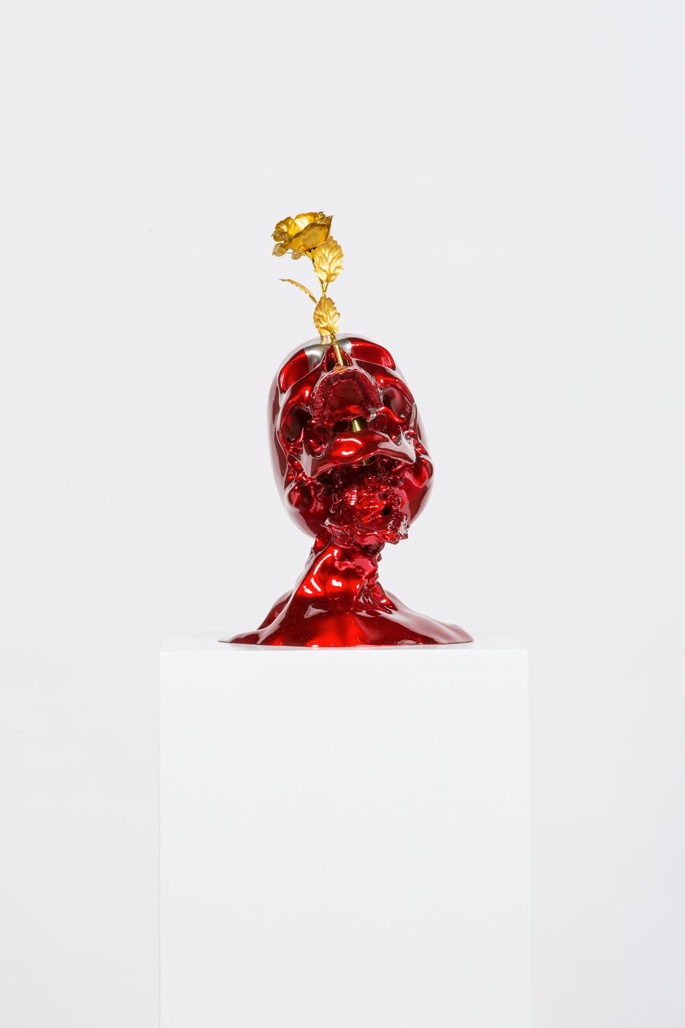 自身の極めて死に近い体験と、千利休のわびさびの観念をクロスさせ、惨事や痛みをも「美」とするために表現した立体作品。首の骨を折る大怪我は生を揺るがす大事件、大惨事でした。その惨事を呪う日も少なくありませんでしたが、今日までの時間の経過と共に、その惨事によってもたらされた事象について祝福できるようになりました。事故が起きた当時の患部はそっくり再現され、その要因となった場所から芽が伸びています。そして花を咲かせるようになりました。惨事が無ければ花は咲いたのでしょうか。マザー・マリアの慈悲の心を称すバラが一凛ひっそりと添えられています。